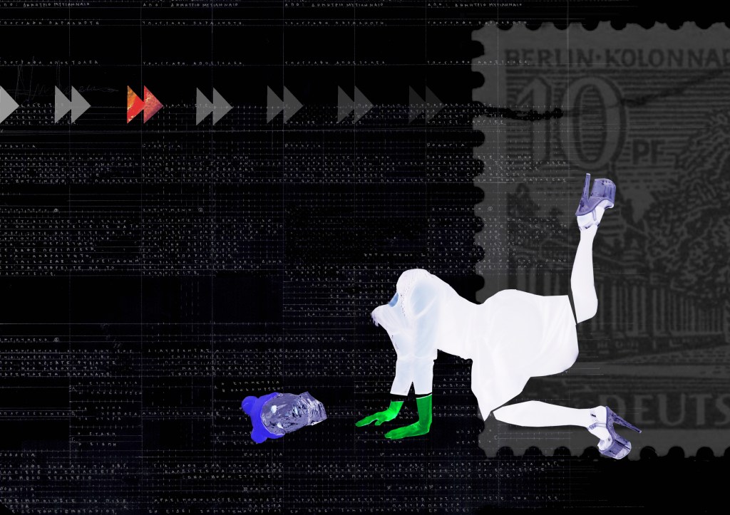 Besuch* is a video-collage representing a multilayering choreographic composition. Five artists with diverse practices meet in order to exchange artistic forms through interpersonal, original invitations and propose a digital co-creation. Besuch team meets in virtual environments which constitute the place of their artistic interaction. They commit themselves for over a month to dig into their various approaches, to exchange aesthetic means, to co-figure a universe and make it inhabit the screen. A shared file of instructions with colourful ideograms, a microscopic plan in large size, a DIGI-persona, a painting of sensorial stimuli and a contract via post become the jointly common score to which the team commits. They exchange these five materials and promise to visit each other’s proposal through a one-minute performance. Finally, they agree to co-edit the 25 variations and thus to compose Besuch.