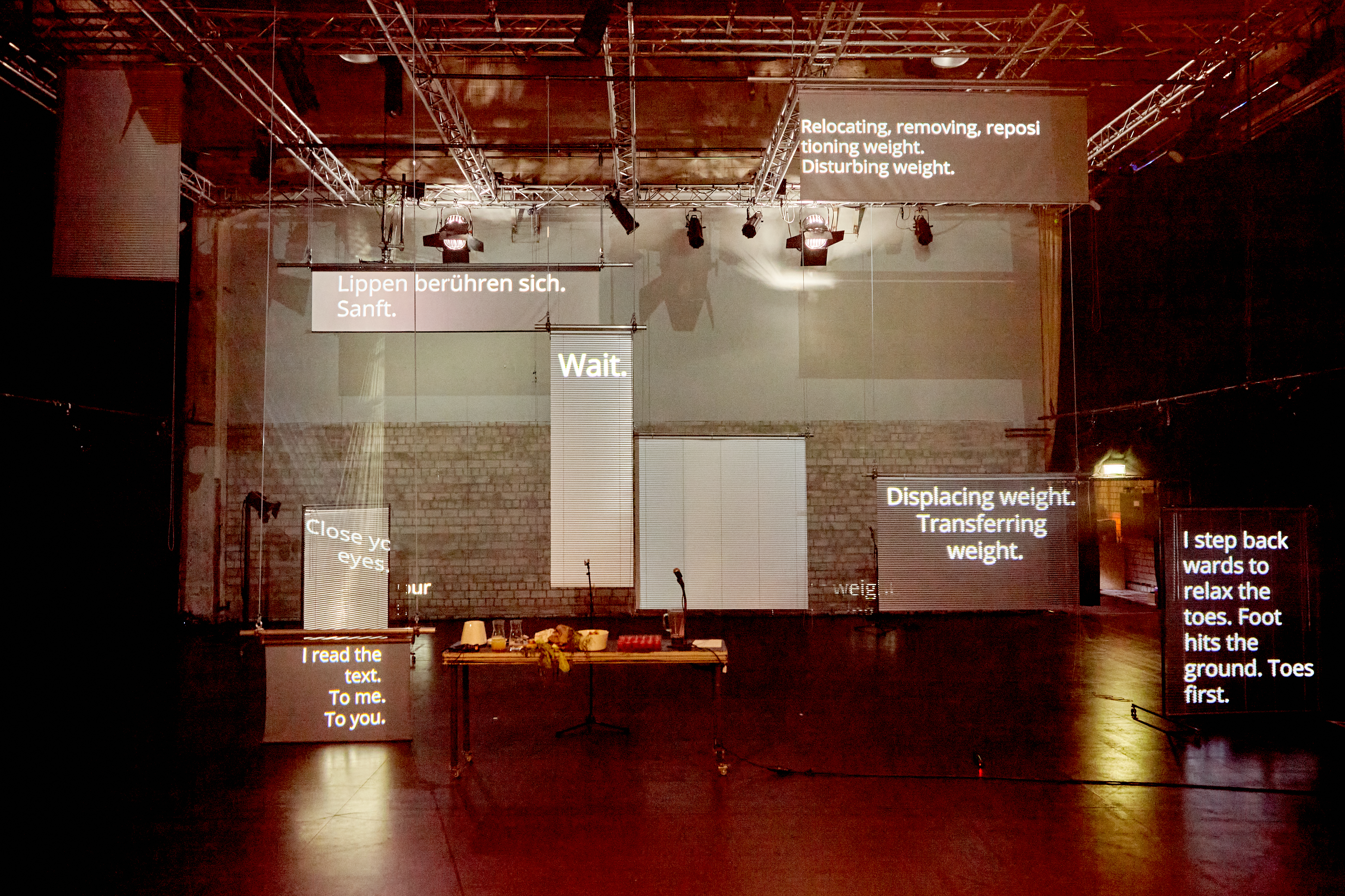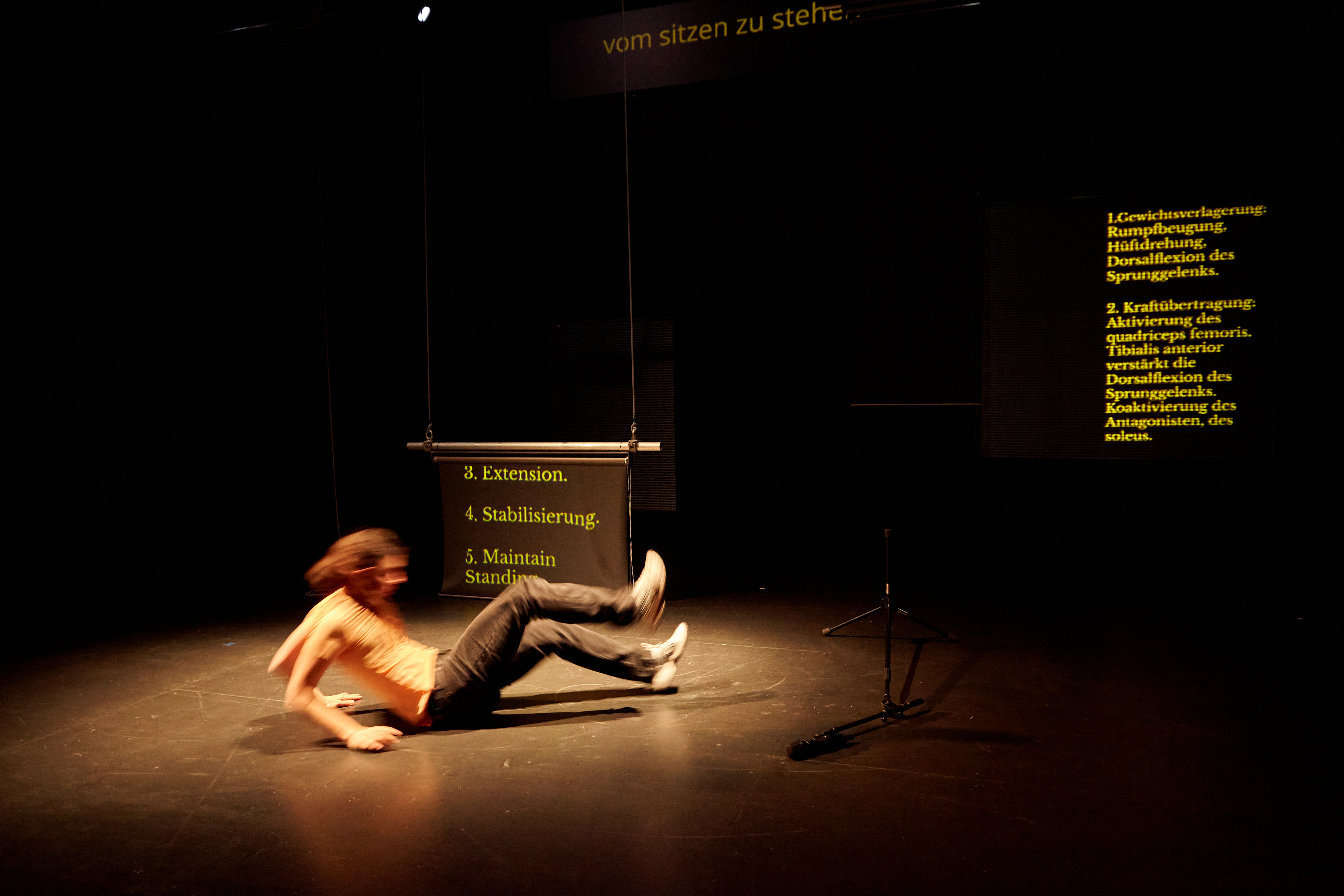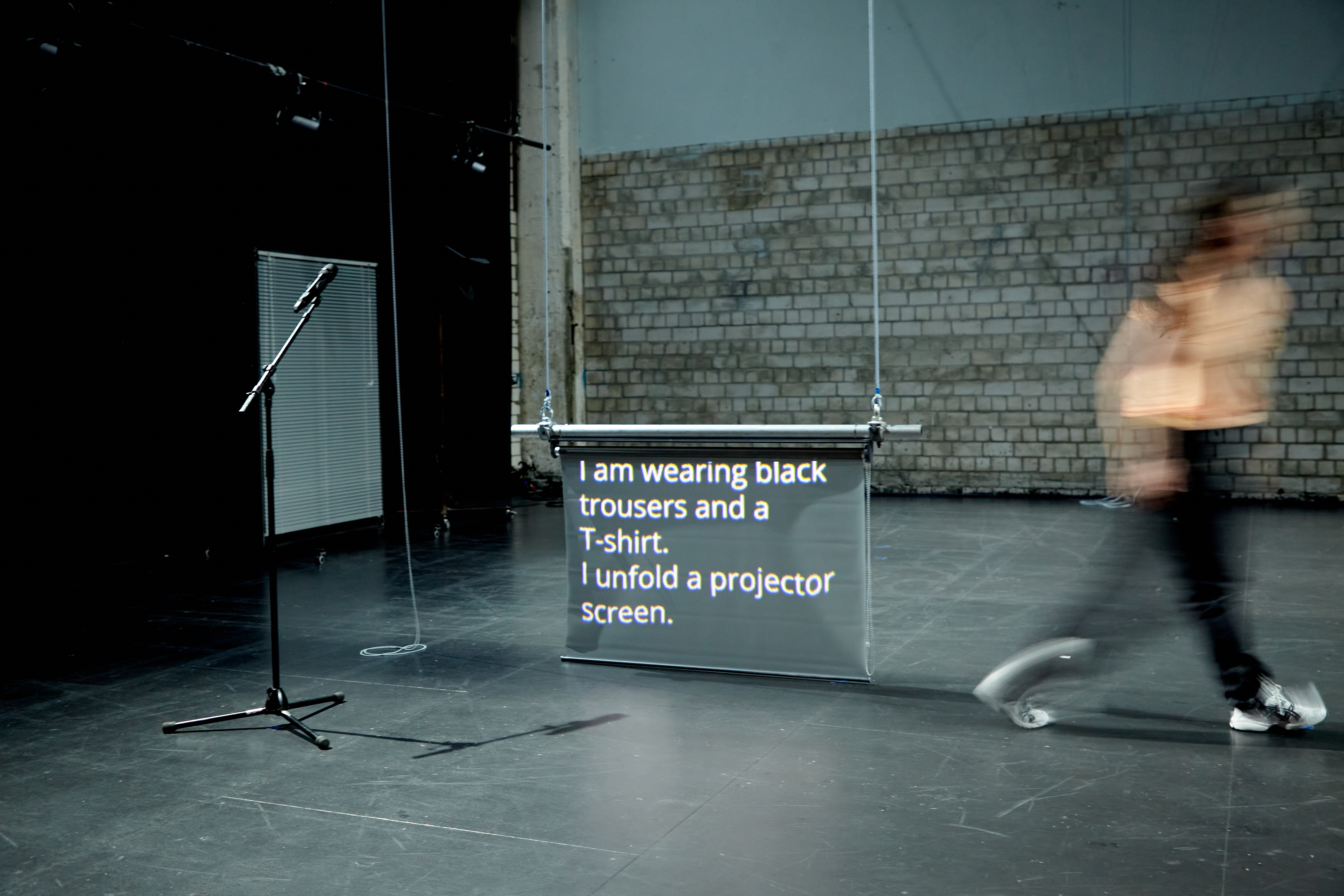 “Phrases” investigates the subtle space between the things that we see and those we don’t. Reconsidering tools of accessibility, Venetsiana Kalampaliki uses text and movement as her basic tools to build a narration that travels from the very inside of the body to the extended environment that we share. By applying the simple acts of sitting, standing, stepping and jumping, the stage is transformed into a moving text, proposing multiple ways of perceiving what is seen and what is heard, what is done and what is said. With a wide range of descriptive elements, from anatomical mechanisms of movement to dictionary definitions, the performance navigates the audience to factual yet fictional landscapes.